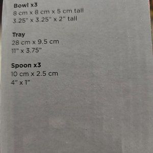 • Set of 7 includes (3) bowls, (3) spoons and serving tray