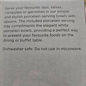 Serve your favourite dips, salsas compotes or garnishes in our simple and stylish porcelain serving bowls with spoons. The included porcelain serving tray compliments the elegant white porcelain bowls, providing a perfect way to present your favourite foods on the dining or buffet table.