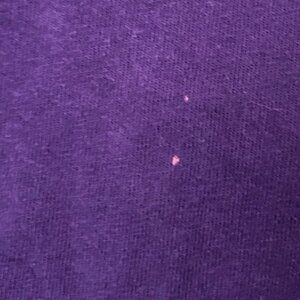 Wear to screen-printing (see pics), and two very small bleach spots (see pic). Otherwise, great worn condition!