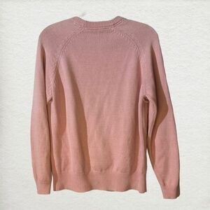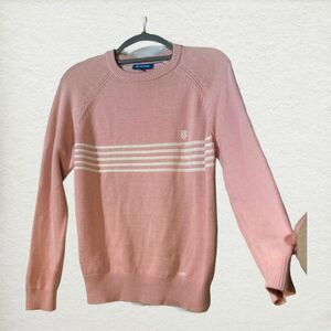 This K-Swiss women's pullover sweater is a regular fit, size Large, and features a sporty, casual theme. It is pink with a striped pattern and has a crew neck and long sleeves. Made from a cotton and acrylic knit fabric, it includes a logo accent. Suitable for fall, this sweater is designed for casual occasions. It is manufactured in China and requires hand washing. The item is pre-owned.