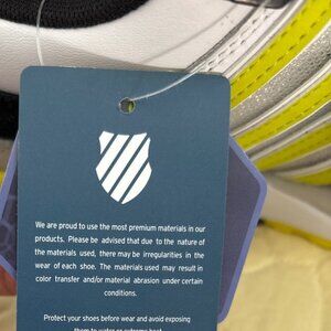These K-Swiss athletic shoes boast a vibrant yellow and white color scheme, perfect for making a statement during workouts. Designed for comfort and durability, they feature a sleek low-top silhouette with a supportive rubber outsole. Ideal for both training and casual wear, these shoes offer a modern and energetic look.