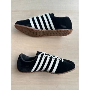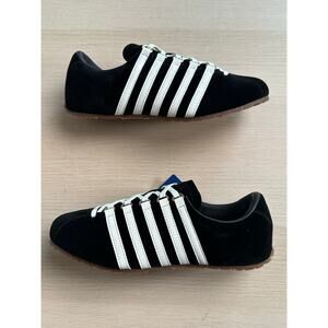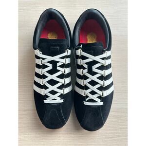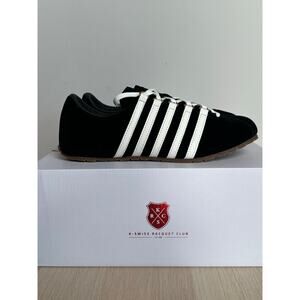 Elevate your sneaker game with the ultra-exclusive K-Swiss x Anwar Carrots Before the Classic Black Sneaker in size 8M—brand new and unworn from the groundbreaking K-Swiss Racquet Club (KSRC) Drop 2, where streetwear maestro Anwar Carrots unearths a rare 1960s unreleased prototype for a sleek, minimalist masterpiece. This low-profile icon rocks a luxurious black velvet upper for that premium, understated edge, accented by metallic gold lace loops, crisp white leather stripes, and an ultra-thin gum sole for effortless grip and timeless California cool. Blending archival tennis heritage with modern street flair, it's the versatile collector's pick for urban explorers or court purists—don't miss this September 2025 gem before it's archived forever!