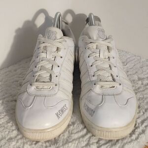 These white leather K-Swiss women's sneakers are a size 8. They lace up and have cushioned insoles for comfort. Pre-owned and in great condition. All offers are welcome.