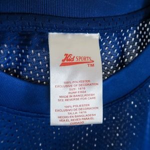 Kid Sports. NCAA, Big 12, University of Kansas t-shirt jersey. Blue see through mesh with red stripes around the shoulders. “Kansas” written across the chest in red with a white outline. Back is plain. Would be cute styled with a bralette underneath. Can be worn regularly or styled cropped. Perfect for a KU student on game day! 100% polyester