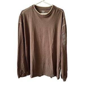 Mens size XL, brown, long sleeves, crewneck, pullover, thumbholes, zip pocket on left sleeve, logo on back yoke.