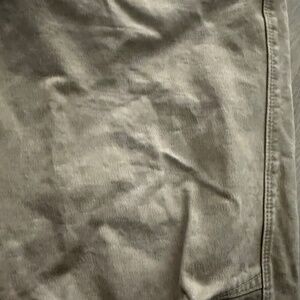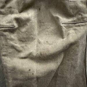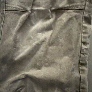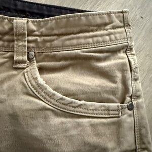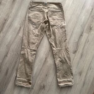 Ruggedly comfortable Eurotwill Fabric tapered fit reinforced pockets Stelth Phone pocket premium cotton spandex blend with Patina dye technology weathered and distressed while maintaining durability has some staining shown in photos move freely through hikes climbs without restriction Great Pants Khaki color size Medium 33X32 Thrashed Casual versatile Y2K Rugged Outdoors Fall Winter Active Work