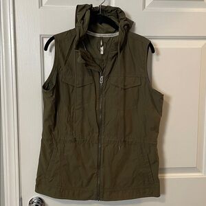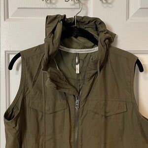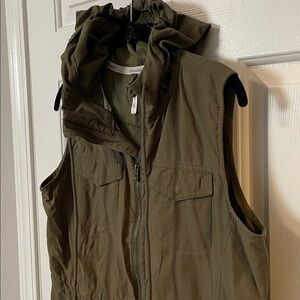 Stylish olive green sleeveless vest with a hood. Features a front zipper and pockets.