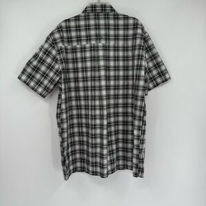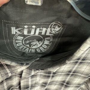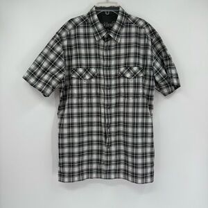 KUHL Rumblr Shirt Men's Black Gray Plaid Size Large Pearl Snap Short Sleeves. Polyester with ionik. Flap front pockets with snaps. Collared. Lightweight. Chest 48. Length 30. Measurements are approximate. Very good preowned condition.