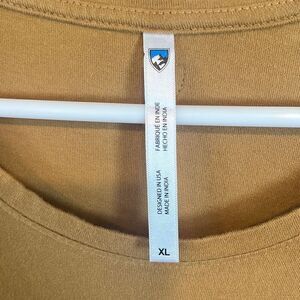 This t-shirt is made by Kuhl. It’s a mustard yellow short sleeve with a rounded hemline. Size XL and in very nice preowned condition. Smoke and pet free home.