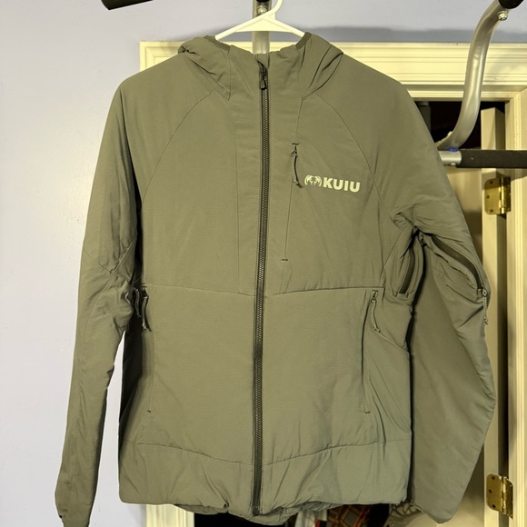 KUIU jacket in charcoal. Features a sleek design with a front zipper and convenient side pockets.