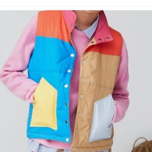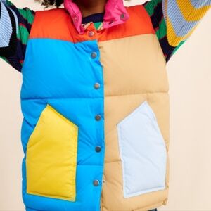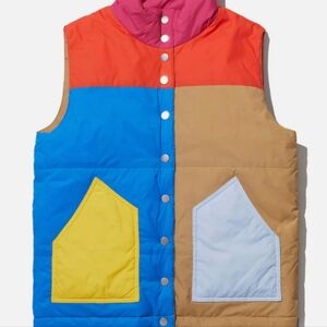 Vibrant puffer vest with bold color blocks. Features blue, red, tan, and yellow accents. Ideal for a standout look.
