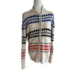 This KULE cozy women's cardigan features a striking pattern with vibrant red and blue accents, perfect for staying warm in style. 55% wool, 45% cotton. Gently pre-loved in excellent condition. Great for outdoorsy, academia, preppy, professional and casual looks.