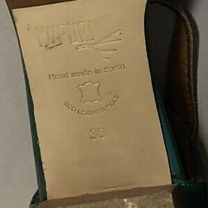 ♡ Women's size: 38 EU, 7-7.5 US. Green, Silver. Color Block, Ankle buckle strap, One of the insole lining has been torn where the ball of the foot would sit, Chunky heel, Platform, KUPURI Women's Anthropologie Peep Toe Slingback Heels Size 7.5 Green Silver. Pre-loved item looks in good condition to me, please be aware of some natural wear, stains and distressing. See descriptive photos for approximate measurements, condition, No care/material tags.