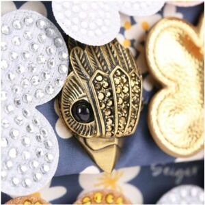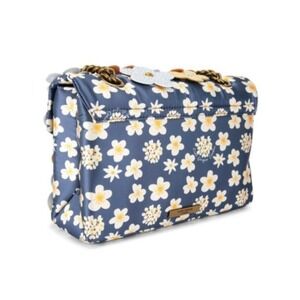 An explosion of blooms awaits with this exquisite statement bag. The eye is immediately drawn to the fanciful arrangement of dimensional flower embellishments, shimmering in gold, silver, and pearly white. A twist-lock closure secures your essentials inside. The sturdy top handle offers a classic carrying option, while the gleaming chain strap adds a touch of edgy glamour, ready for a night on the town. It's the perfect piece to elevate any outfit, whether attending a garden party, celebrating a special occasion, or looking to add a bold flourish to everyday style.