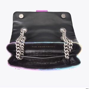 The Leather Kensington Purse is crafted from soft metallic laminated pebble grain cow leather with iconic rainbow sewn stripe pattern. The antiqued silver Eagle head features rainbow colored crystals and black crystal eyes on the front flap.
