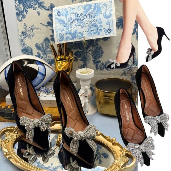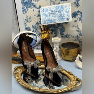 The Belgravia Bow court heel arrives in a black velvet. The pointed toe is topped with a large crystal bow. The silver Eagle head features crystals and black bead eyes sitting in the middle of the bow.