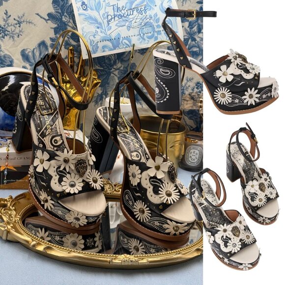 🆕 KURT GEIGER LONDON 🧿 NWOB Flower Western Platform Heel Sandal, Sz 37 US 7