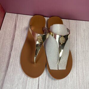 From Kurt Geiger London, the Maddison Patent Two Tone Logo Ornament T-Bar Sandals feature: