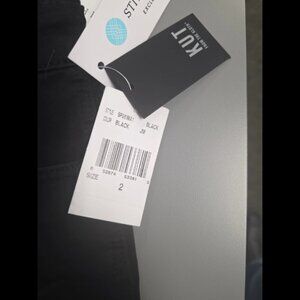 These are a pair of women's black denim jeans from the brand KUT from the Kloth, a Los Angeles-based label known for premium-quality denim at accessible prices. . The specific style is SP581MA1, which is a high-rise ankle slim straight leg fit, designed for a sleek, elongated silhouette that's versatile for casual or dressed-up looks.