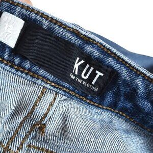 These KUT from the Kloth jeans channel laid-back cool with their vintage-inspired distressing, raw edge hems, and classic light leg. The mid-wash blue tone offers an effortless worn-in vibe while subtle rips and fading lend a touch of edge. Size 12 with a flattering mid-rise fit.