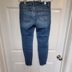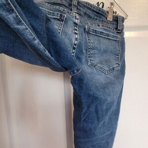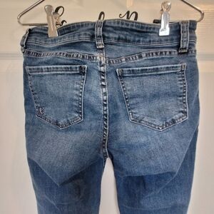98% cotton, 2% spandex. Connie Skinny Ankle. Unfinished leg hems. Mid Rise. Good condition. These are a small size 4. There isn't too much stretch to them.