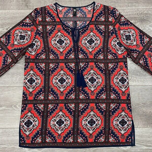 KUT From The Kloth Boho Print Tunic Tassel Keyhole 3/4 Sleeve Top M