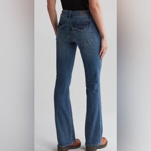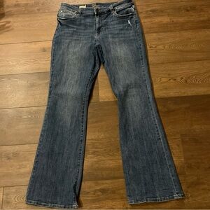 This is a pair of women's Nicole bootcut jeans by KUT From The Kloth in size 14. They feature a solid blue color with a light fade wash, 5-pocket design with flap pockets, a mid-rise waist, and a relaxed fit. The jeans have a zip and hook & eye closure, and are made of 72% cotton, 23% polyester, 3% rayon, and 2% spandex. The inseam is 22.5 inches, making them suitable for winter, summer, fall, and spring seasons.