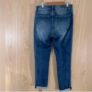 These super cute jeans are in new condition, in a deep blue denim color. They are boyfriend/ girlfriend style, have a cute tiny pocket detail, stretch for comfort, are high rise and flattering.