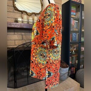 • Pattern: Kaleidoscope/Mandala print with a mix of orange, yellow, green, black, and white