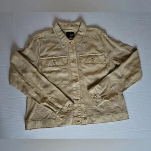 KUT from the Kloth Abigail Khaki Lightweight Button Up Top NWT XL Layer up in style with this chic - lightweight cargo inspired top styled with chest flap pockets, a crisp spread collar, and washed soft neutral fabric. Button tabs on each side of banded hem.