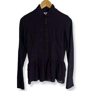 This is a KUT from the Kloth black zip-up military-style jacket with ruffle detailing at the bottom