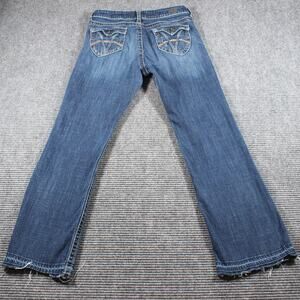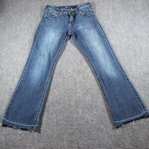 Style: Mid-rise bootcut; 5-pocket with button-flap back pockets; zip fly; contrast stitching; raw/frayed hems