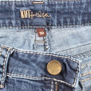 Everyday bootcut denim with classic KUT stretch and signature flap back pockets. Medium-wash fading, contrast stitching, and a raw/frayed hem for a laid-back look. Color may vary slightly from photos due to lighting and monitor settings.