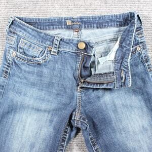 Key Note: Signature embroidered/button-flap back pockets; flattering bootcut leg