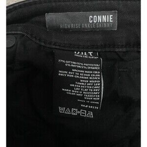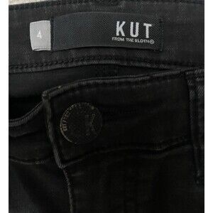 KUT from the Kloth Connie High Rise Ankle Skinny Black Distressed/Raw Hem Jeans in size 4 feature a high rise waist, ankle length cut, and a skinny fit. Made from a denim fabric, these jeans are accented with a logo detail and a distressed/raw hem for added edgy style. With a 5-pocket design and a cotton blend material, these versatile jeans can be worn year-round and are machine washable for easy care. Perfect for adding a touch of chic and modern to any wardrobe, these KUT from the Kloth jeans are a stylish and practical choice for any woman.