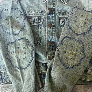 A faded-wash denim jacket scattered with studs and rhinestone ensures retro-topped ensembles.