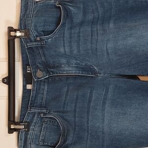 KUT from the Kloth Kelsey high-waisted flare leg jeans with patchwork insets on the sides. Soft denim material.