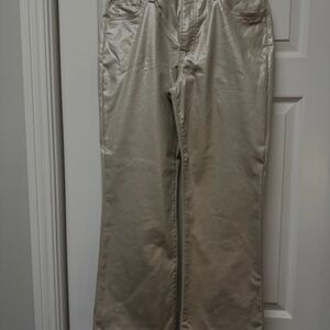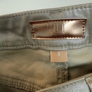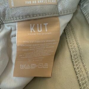 Great for the holidays! KUT from the Kloth Kelsey Ab Fab high rise ankle flare in soft gold, (actually more tan, not brassy!) metallic coated denim. Size 8 ( but they run large) Worn twice, pet and smoke free home. 97% cotton, 3% spandex. 27” length.