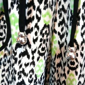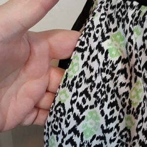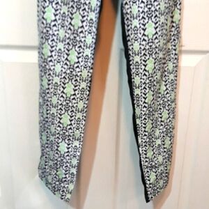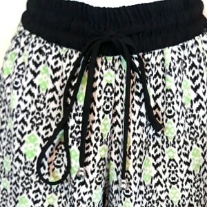 These are a gorgeous pair of lightweight nylon pants. They are made from KUT from the Kloth. I love these. They have a nice thick stretch waistband with black pulleys that have silver beads on the ends. They have 2 side pockets. The front is black white and a touch of lime green in a tribal print. The back is all black with 2 faux pockets. These are Brand new WOTs. Size S. Measurements are approximately lying flat 13 to 16". Inseam 30". New!! Gorgeous from sneaks to heels. Nice free flowing!