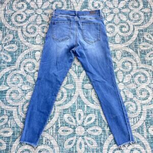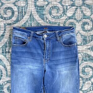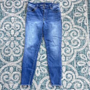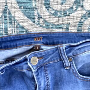 KUT from the Kloth women's jeans in a medium wash. These "Fab Ab" style jeans are a high-rise, cropped skinny fit. The fabric content is a blend of cotton, polyester, rayon, lyocell, and spandex for a comfortable stretch. They have a raw, frayed hem.