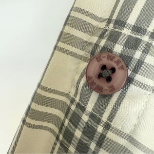 Elevate your casual wardrobe with this versatile gray plaid button-up shirt. Designed for comfort and style, its long sleeves and regular fit make it perfect for any laid-back occasion, from weekend outings to casual Fridays at the office. The collared neckline and technical design add a touch of sophistication, while the machine-washable polyester fabric ensures easy care. Whether you're meeting friends or running errands, this shirt keeps you looking sharp. Pre-owned but in good condition, ready to be a staple in your collection. Note: there are yellow discolorations under the armpits.