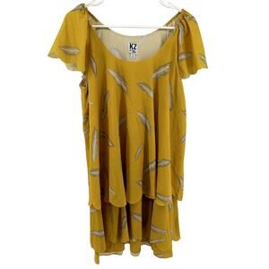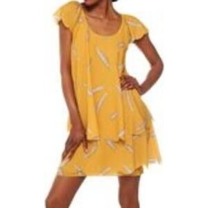 KZ By Karen Zambos Feather Print Layered Mini Dress Scoop Neck Yellow Medium
