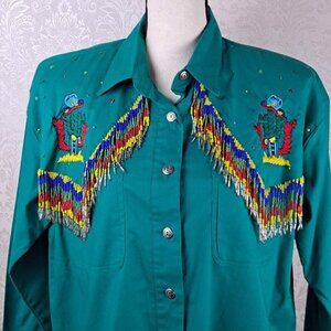 KZK Size Medium Green Rodeo Style Button Down Shirt Embroidery Beaded Vintage