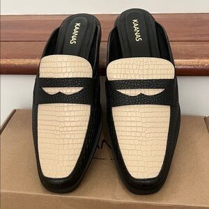 Kaanas Black and Cream Croc-Embossed Mules Run small - fits like an 8
