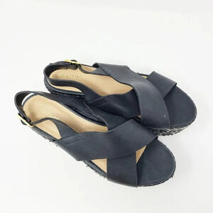 Kaanas Metalik Ada Leather Crossover Platform Wedge Sandals in black and silver. Adjustable buckle closure at ankle.. These are in New Condition, but feature fraying along the bottom edge of the raffia in areas. Price reflects.
