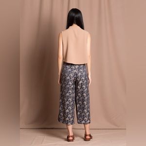 From Vietnamese-American brand Kaarem. Navy blue jacquard with gold stitching. Relaxed wide leg pant with overlapping slits at the leg opening. Side seam zipper with clasp enclosure. Structured yet flowy and soft fabric.