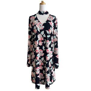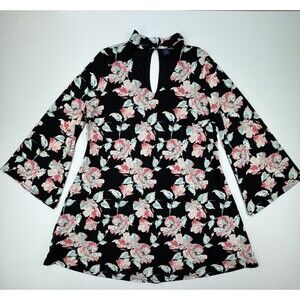 Kaari Blue 1X Boho Floral Bell Sleeve Keyhole Indie Festival Dress Black Pink