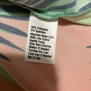 Colorful tropical blouse with vibrant palm leaf design. Features shades of green, orange, and black. Off the shoulder sleeves.