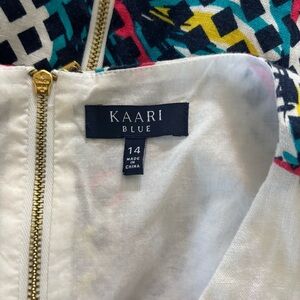 Brighten up your wardrobe with this colorful Kaari Blue sleeveless dress! Featuring a flattering fit-and-flare silhouette, bold floral geometric pattern, and an exposed gold zipper in the back. Perfect for garden parties, brunches, or summer getaways.
