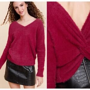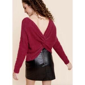 Super fuzzy and soft, Kaari Blue long sleeve eyelash sweater. Pretty knot detail in the back, raspberry color, machine wash.